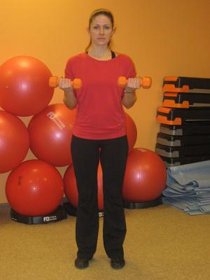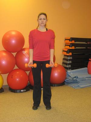 5. Сгибание рук с гантелями на бицепс. Встаньте прямо, ноги на ширине плеч, в каждой руке по гантеле. На выдохе согните руки и поднимите гантели к плечам. Следите, чтобы локти оставались на месте. На вдохе опустите гантели в исходное положение.