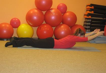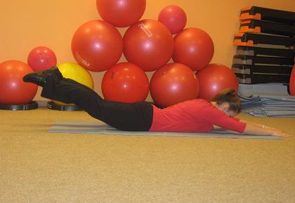 8. Обратные подъемы корпуса и ног. Лягте на живот. Прямые руки вытяните перед собой, ноги соедините. Голову не запрокидывайте, смотрите в пол. Плавно на вдохе приподнимите руки и грудь. На выдохе вернитесь в исходное положение. Затем поднимите прямые ноги, стараясь оторвать от пола не только голени, но и бедра. Слишком высоко конечности не поднимайте.