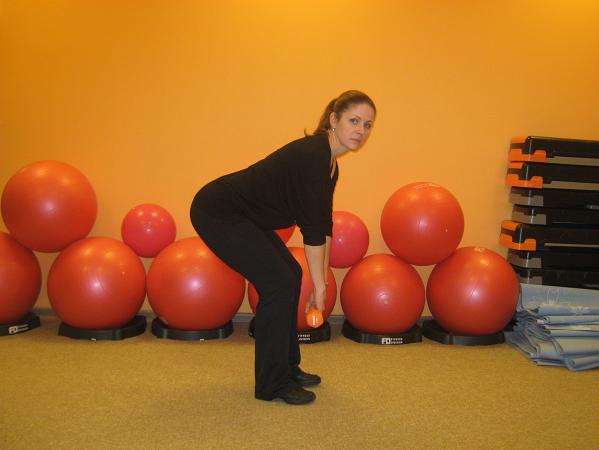 2. Становая тяга. Возьмите гантели, встаньте прямо, слегка согните колени, гантели держите перед бедрами. На вдохе медленно наклоняйтесь (гантели ведите максимально близко к ногам) и одновременно отводите таз назад. В нижней точке туловище — параллельно полу. На выдохе медленно распрямитесь. В исходном положении задержитесь на секунду и приступайте к следующему повтору.