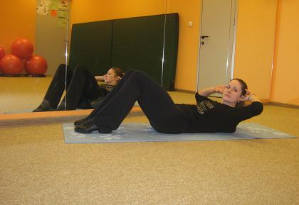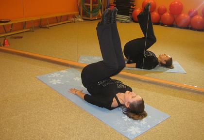 4. Маятниковые скручивания. Лягте на спину. Можно подложить под ягодицы сложенное полотенце так, чтобы поясница округлилась и не отрывалась от пола. Руки положите за голову, пальцы на затылке, ноги согните, ступни — на полу. Потянитесь грудью вперед и на выдохе плавно оторвите плечи и лопатки от пола. На вдохе вернитесь в исходное положение. Затем на выдохе подтяните колени к груди, а на вдохе вернитесь в исходное положение.