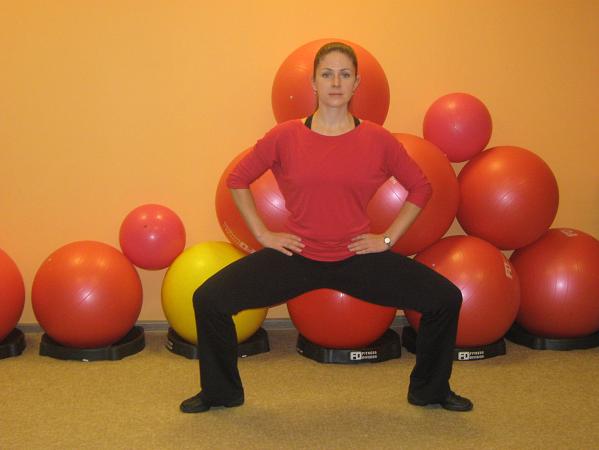 3. Приседания-плие. Встаньте прямо, широко расставьте ступни и разверните их наружу. Удерживая спину идеально прямой, на вдохе медленно опуститесь в глубокий присед. В нижней точке приседа дополнительно статически напрягите мышцы ягодиц. На выдохе не "отпуская" ягодиц, медленно распрямитесь. Без остановки начинайте следующий повтор.