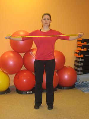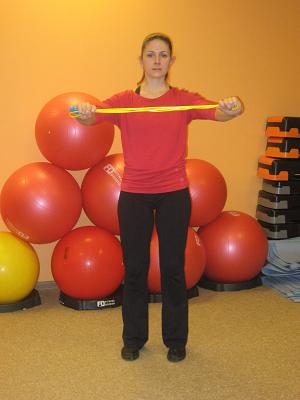 4. Разведение рук с амортизатором. Поставьте ноги на ширине плеч. Возьмите амортизатор. Разводя руки в стороны, ладонями к земле, растяните его до упора, сводя при этом лопатки. На вдохе медленно вернитесь в исходное положение и повторите.