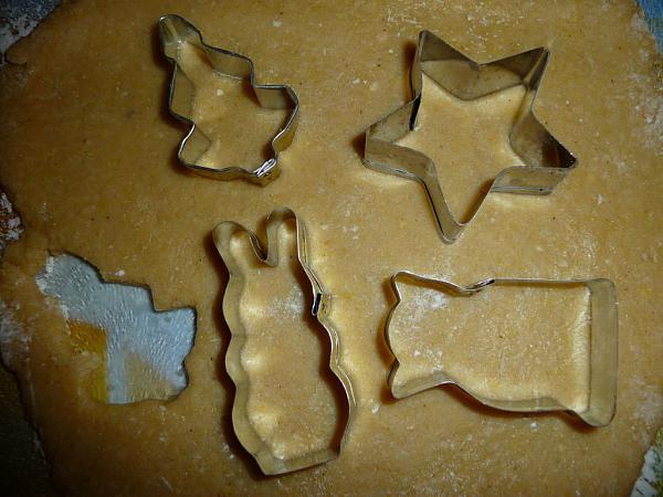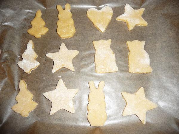 Раскатать тесто на присыпанной мукой поверхности. Его толщина должна быть около 5 мм. Формочками для печенья вырезать фигурки.