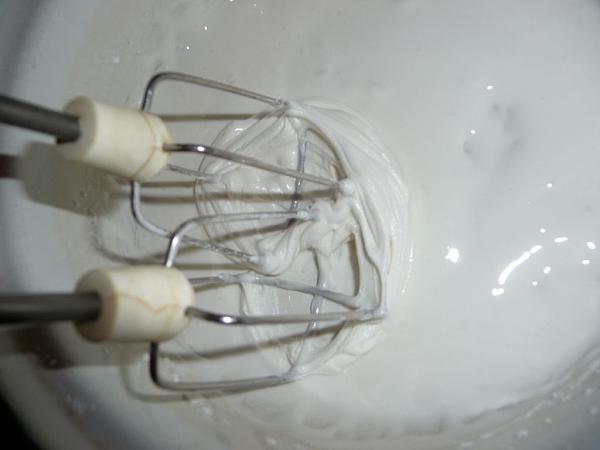 Взбить половину яичного белка до появления пышной пены. Всыпать 50 г сахарной пудры, взбивать до крепких пиков. Затем добавить оставшуюся сахарную пудру и взбивать еще около минуты.