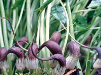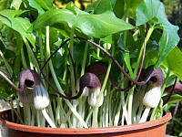 Очень необычное растение, которое, к сожалению зимует в наших садах не особенно хорошо (5 зона), только под укрытием. Но каково! Листья небольшие стреловидные, около 10 см в высоту. Весной образуют коврик. Цветение просто необычайное. Цветы похожи на зверьков с длинными хвостами, которые что-то нюхают на земле. Покрывало узкое, пурпурно-белое, плотно облегает початок и заканчивается узким "хвостом". Англичане из-за цвета и формы сравнивают его с редиской. Аризарум цветет весной. Предпочитает рыхлую влажную почву, тенистые места. Растение для коллекционеров.