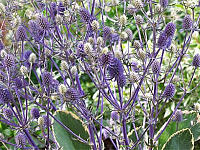 Необычный и привлекательный синеголовник. В высоту достигает 60 см, в ширину разрастается до 30 см. Цветет в июне-июле. Зимостоек (4 зона). Прелесть новинки в том, что молодые листья у 'Jade Frost' совершенно розовые. Потом зеленеют, сохраняя некоторое время розовую кайму, и наконец, в зрелом возрасте обрамляются кремово-желтой каймой. Цветение обильное, соцветия и побеги ярко-синие. Общий вид растения нарядный и элегантный одновременно.