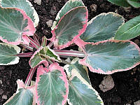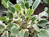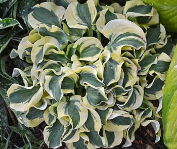 Весной листья зеленовато-голубые с красивой желтой обводкой. В середине лета листья становятся зелеными, кайма расширяется и приобретает кремово-белый цвет.