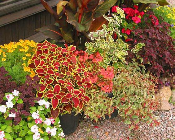 Наиболее ценны для мобильных цветников растения, способные сохранять декоративность в течение всего летнего сезона: канны, колеусы, плектрантусы, бальзамины. Совершенно незаменимы культуры длительного цветения: пеларгонии и петунии, фуксии, сутеры, бархатцы.