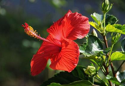- Гибискус, или китайская роза — его листья хорошо улавливают пыль и очищают воздух. Растение необходимо хотя бы раз в неделю ополаскивать под душем.