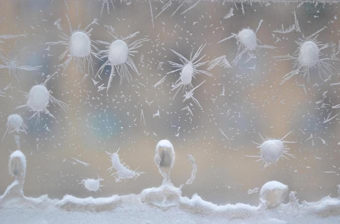 Если охлаждение поверхности оконного стекла начинается при положительной температуре и более высокой относительной влажности и в процессе охлаждения проходится точка росы, то на охлаждающейся поверхности сначала отлагается пленка воды, которая уже при отрицательных температурах закристаллизовывается в виде дендритов.