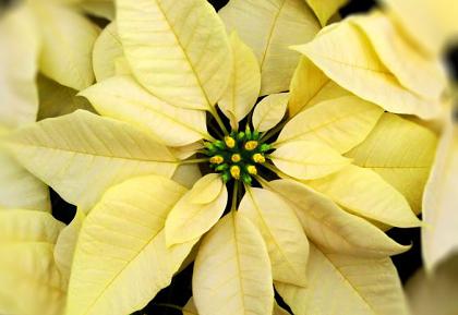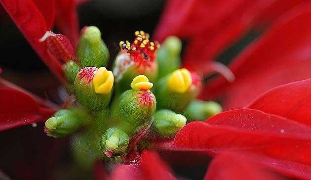 Декоративный вид пуансеттии придают не цветы, они у нее мелкие и невзрачные, а прицветные листья, которые ярким венком обрамляют их.
