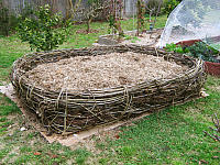 В средней полосе России проще всего сплести большую "корзину". Ветки ивы, черемухи, рябины легко гнутся и достаточно прочные, но их необходимо подсушить или снять кору, прежде чем наполнять грядку землей, иначе они дадут корни.