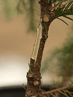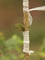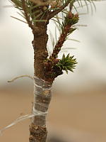 Судить о том, прижились ли прививки, можно по наличию молодого прироста. Неприжившиеся черенки засыхают и с них облетают иголки за 2-4 недели. Если вы использовали не разлагающуюся под действием ультрафиолета обмотку, ее необходимо размотать и ослабить, когда прививки тронулись в рост. Окончательно снимаем обмотку ещё через месяц или даже позже.