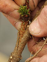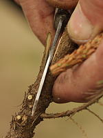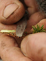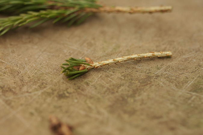 Сначала подготавливаем подвой: удаляем руками или ножом иголки в тех местах, где будут прививки. Также можно и нужно удалить мешающие веточки. На подвои идут одно-, двухлетние черенки. Хвою на них также удаляем, оставляя лишь немного на макушке. Лишняя хвоя испаряла бы влагу и иссушала черенок.