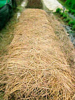 Посыпаем картон измельченной соломой (не содержит сорняки), лучше бобовых, сверху — соломой с длинными стеблями (они будут держать форму насыпи). Снова все это поливаем.
