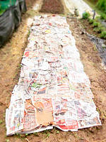 Поверх мокрой травы выкладываем листы картона, чтобы подавить сорняки. Картон тоже надо тщательно смочить.