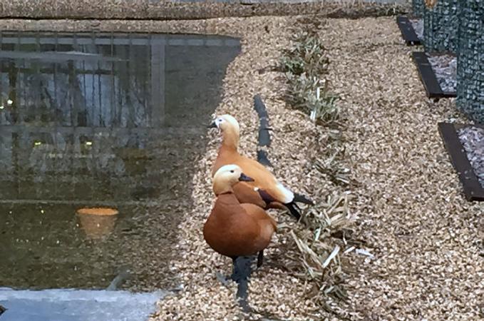 Большой пруд сада ещё покрыт льдом, поэтому огари гуляют и пьют воду из маленького водоёма за "Садом лекарственных трав". Они прилетают максимально рано, чтобы застолбить себе место: если прозевать время, другая пара огарей может выставить свои претензии на водоёмы "Аптекарского огорода". Кстати, на открытой воде уткам проще спасаться от местных кошек.
