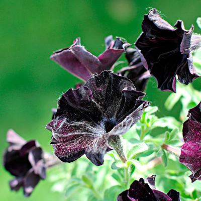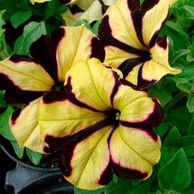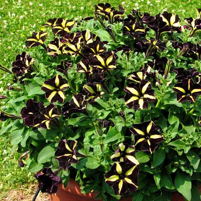 Чем-чем, а расцветкой современные летники могут не то что удивить — сразить наповал. Новенькие петунии 'Phantom' (почти чёрная с ярко-жёлтой звездой) и 'Black Velvet' (совершенно чёрная) купить пока не удастся. Не успели, наверное, размножить. Обе — победительницы конкурсов 2010 года. А вот заказать у Suttons Seeds сорт 'Queen Bee', очень на 'Фантом' похожий, можно.