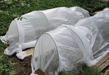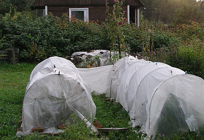 Простейшее укрытие легко соорудить из нескольких одинаковых кусков металлопластиковой трубы, согнутых в дугу и установленных в ряд на расстоянии примерно 50 см друг от друга. Сверху натягивается обыкновенная плотная пленка или любой другой укрывной материал: в 1 слой на случай небольшого похолодания и в 2 слоя, если похолодание обещает быть устойчивым.