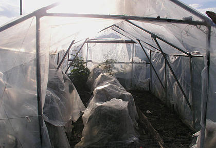 В случае, когда растения внутри теплицы укрыть не получится (не будете же вы снимать с опор уже подросшие томаты и плети огурцов), утеплять необходимо саму теплицу. Для этого соорудите из тех же материалов дополнительное покрытие. Закрепить его можно как снаружи, так и внутри.