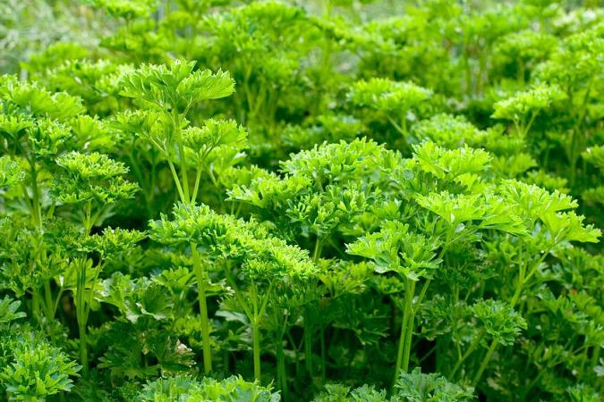 Семена петрушки прорастают ещё медленнее. Чтобы ускорить этот процесс, их нужно замочить во влажной ткани и прорастить при комнатной температуре. Повышает энергию прорастания закалка семян: когда у 5-6% семян появятся ростки, их на 10-12 дней помещают в холодильник (температура 1-2 °С). При такой подготовке семян всходы появляются на 5-7-й день. Высевают проросшие семена на грядку в бороздки, расстояние между бороздками — 45 см, между растениями — 2-3 см.