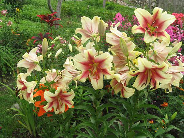Июль — пик цветения. В августе поздние сорта могут цвести, если позволяет погода, но у нас это бывает редко. Пятого августа начинаются моросящие дожди, цветущие лилии приходится укрывать, получается больше хлопот, чем радости.