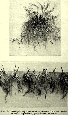Рис. 24. Вверху - неразделенное корневище того же куста, внизу - корневище, разделенное на части.
