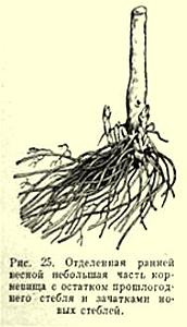 Преимущество весеннего деления корневищ состоит в том, что весной куст можно разделить на очень большое количество частей, лишь бы на каждом отделенном куске имелась ростовая почка ("глазок") и небольшое количество корней (рис. 25).