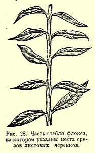 Рис. 28. Часть стебля флокса, на котором указаны места срезов листовых черенков.