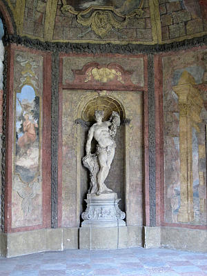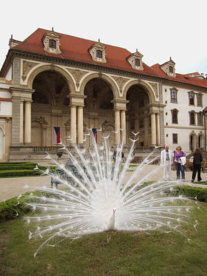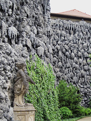 Знаменитый Вальштейнский сад в этом смысле исключение. Он здорово "раскручен" благодаря крапниковой (сталактитовой) стене и белым павлинам, постоянно работающим у Сената. Тёмно-серая стена действительно производит впечатление, причем зловещее. Среди каменно-растительных струй можно разглядеть страшные морды, змей и лягушек. И напридумывать себе Бог знает чего… А это всего лишь забава в духе барокко. Тогда любили пошутить с впечатлительными барышнями.