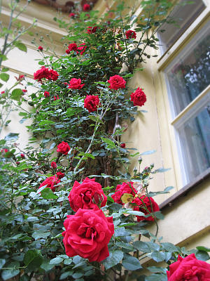 Стены украшают шпалеры с розами. Это настолько мощные рамблеры, что им ничего не стоит забраться на крышу по водосточной трубе. Для тех, кто забрался на самую высокую террасу — еще один подарок: фантастический вид на город.