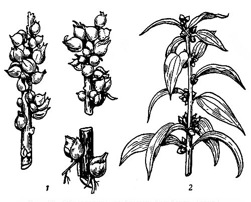 У многих видов можно также вызвать появление пазушных бульбочек искусственным путем, например, окучиванием стеблей землей с одновременным удалением бутонов, нагибанием стебля к земле в месте его выхода на поверхность, помещением срезанных стеблей в воду на 30-60 дней. К таким лилиям принадлежат длинноцветковая и ее формы, Заливского, шафранная, Тунберга с ее формами и гибридами, зонтичная (все формы и сорта), тайванская, столистаая и белая. У последней лилии пересадка с комом во время бутонизации вызывает образование большого количества бульбочек по всему стеблю (рис. 32).