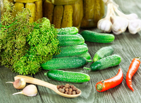 На трехлитровую банку огурцов: 90-100 г соли, 3-6 зубчиков чеснока, 1 чайная ложка 70% уксуса, укроп, листья хрена, дуба, черной смородины и вишни, эстрагон.