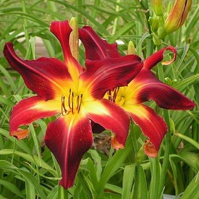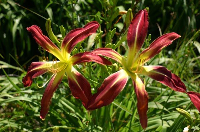 У спайдера есть совершенно четкие параметры: отношение длины лепестков к их ширине должно быть не меньше, чем 5:1. Если лилейник внешне похож на "паука", но не вписывается в эти пропорции, то сорт относят к группе лилейников необычной формы, или UFO. Именно спайдеры держат пальму первенства по величине цветка. Размах (хочется даже сказать "разлет"!) лепестков порой достигает тридцати с лишним сантиметров! Считаю, что настоящий спайдер обязан быть большим. А еще лучше — огромным! Как например 'Tennessee Flycatcher' или 'Orchid Corsage', или обильноцветущий 'Red Suspenders'.