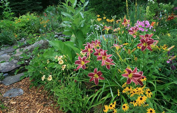 Лилейник среднего или высокого роста можно "задвинуть" и во второй ряд. Высокие сорта вполне годятся и для солитерной посадки. А те, что пониже, с успехом выполнят роль необычного бордюра вдоль дорожки.