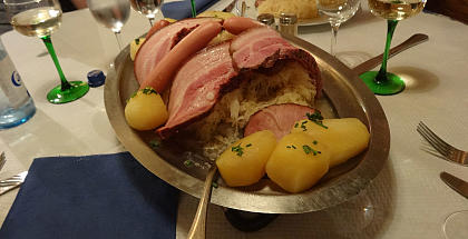 Безусловный символ эльзасской кухни — шукрут (choucroute), где специальная квашеная капуста тушится в рислинге со специями и сервируется со свиной рулькой, беконом, ветчиной и всевозможными сосисками.