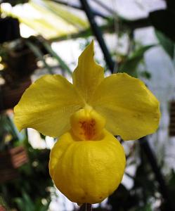 Орхидея-абрикос — вновь громкая премьера очень редкой орхидеи в Аптекарском Огороде! Пафиопедилум абрикосоподобный, или Абрикосовая орхидея, или Золотой венерин башмачок (Paphiopedilum armeniacum), находящийся на грани исчезновения, расцвел на VIII фестивале орхидей, хищных растений и растений пустынь "Тропическая зима".