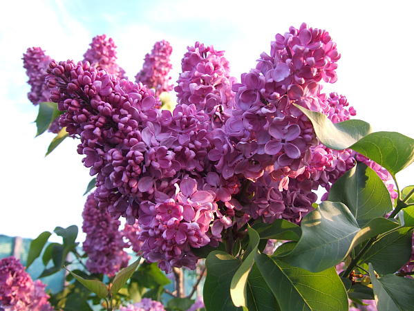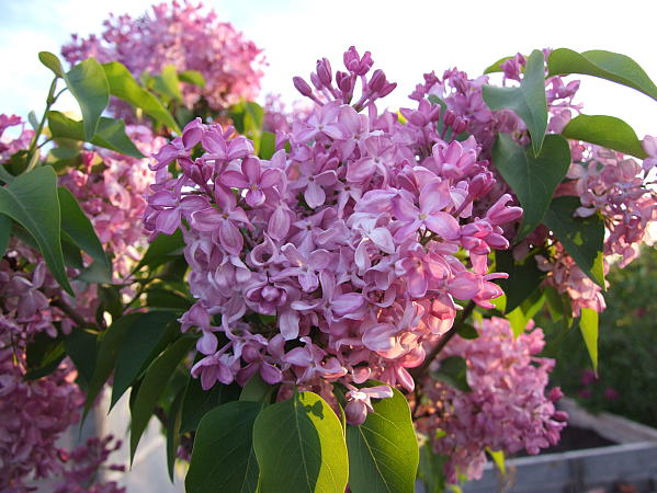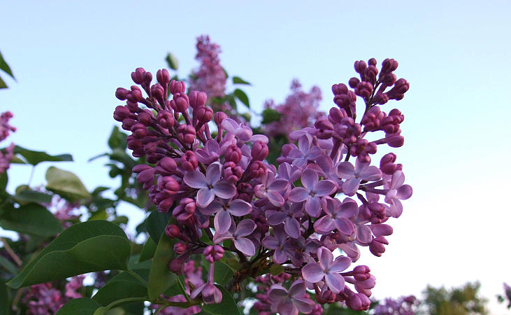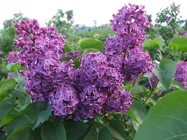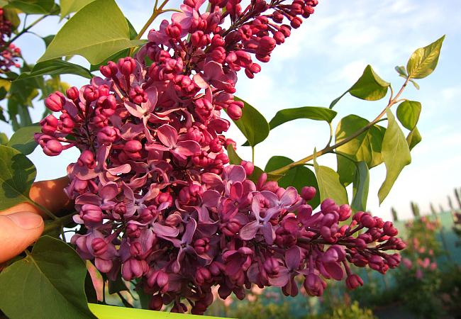 . Пышноцветущий сорт с объемными ажурными соцветиями и цветками в темных закатных тонах. Все его ветви так густо покрыты соцветиями, что листьев почти не видно. А на следующий год он отдыхает, набираясь сил, чтобы опять порадовать роскошным цветением. 'Изумрудная Башня'. Цветки крупные, фиолетово-лиловые с голубоватыми тонами. Они очень красиво светятся, благодаря серебристой кайме с наружней стороны лепестков. Соцветия очень крупные, плотные. Куст высокорослый, компактный. Сорт отличается очень крупной (с ладонь), яркой листвой, которая так плотно покрывает взрослое растение, что ветвей не видно. Монументальный сорт с эффектными соцветиями и листвой.
