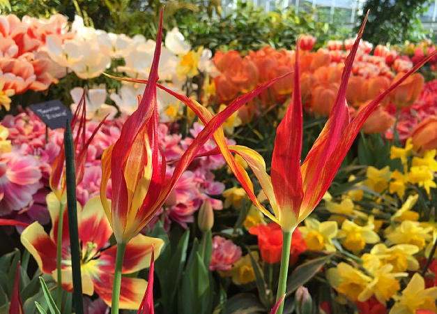Директор "Аптекарского огорода" Алексей Ретеюм: В этом году наши гости увидят в два раза больше сортов тюльпанов, чем в прошлом, включая редкие, новые и самые чёрные в мире "Королева Ночи". Всего на выставке представят более 300 сортов луковичных растений. Посетители смогут ежедневно наслаждаться головокружительными ароматами цветов, которые окутают оранжерею.