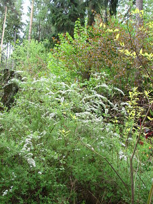 Следующая героиня этой истории — спирея 'Grefsheim'. Отказаться от нее было совершенно невозможно — уж очень она была трогательной, особенно весной, сплошь обсыпанная начинающими распускаться бутонами.