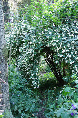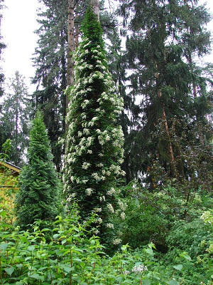 Поэтому мне и голову не пришло, что попавший мне в руки крошечный кустик превратится в обсыпанную нежными колокольчиками полусферу диаметром около 3 метров и начнет в буквальном смысле бороться за место под солнцем с древовидной гортензией и туей 'Smaragd'.