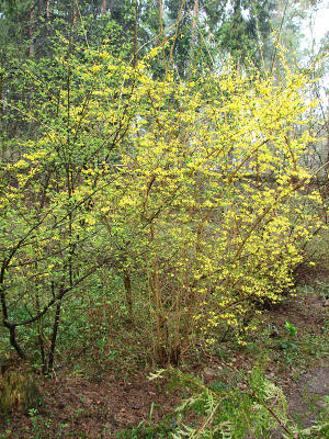 Вылезающие на тропинку ветки приходится обрезать — мешают и могут просто попасть в лицо. Любопытно, что форзиция эта растет почти в ногах у ели, и кустарнику, по-видимому, такое соседство нисколько не мешает. Под форзициеей приютились обыкновенные ландыши, а рядом красуются два огромных бересклета, выращенных из семян, собранных в Главном ботаническом саду.
