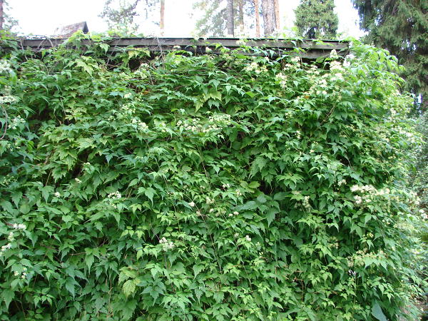 Из вьющихся растений в заросшем кустарниками саду прекрасно чувствует себя — трехкрыльник Регеля, клематисы виноградолистный и прямой, лунносемянник, княжики, гортензия черешковая и неубиваемый девичий виноград.