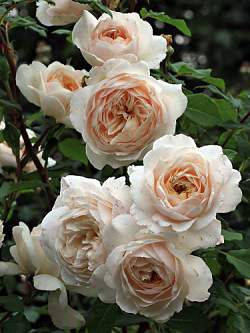 Роза Crocus Rose (Крокус Роуз). Очень устойчивая и обильноцветущая роза, с крупными розетковидными цветками, в начале цветения слегка чашевидными, позже лепестки отгибаются вниз. Цвет нежно-абрикосовый, бледнеющий до кремового к краям. Цветет очень обильно, крупными кистями на концах слегка изогнутых побегов.