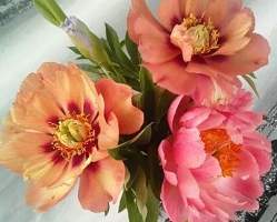 Пион Old Rose Dandy (Олд Роуз Дэнди). Высота куста до 80-100 см. Цветок кораллово-розовый с малиновым центром. Простой, полумахровый или махровый. Цветок звёздообразный, диаметром 10 см, в начале цветения желтовато-бежевый с пурпурным оттенком.
