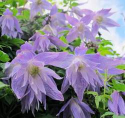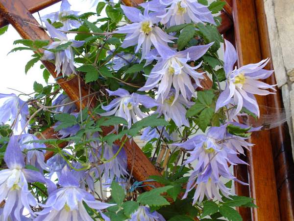 Клематис Maidwell Hall (Майдвел Холл). Цветки светло-голубые, махровые. Обильно цветёт весной на прошлогодних побегах. Повторное цветение летом. Летом и осенью украшен декоративными соплодиями.