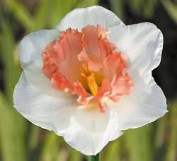 Нарцисс Mon Cheri (Мон Шери). Большие, до 10 см, цветки имеют сливочно-белые околоцветники и гофрированную лососево-розовую коронку, более темную по краю. Продолжительность цветения — от 2-х недель. Отличается прочностью цветоносов, устойчивостью и здоровьем.