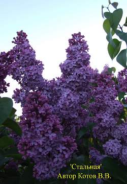 Сирень Стальная. Бутоны среднего размера, фиолетово-лиловые. Цветки среднего размера, простые, фиолетово-лиловые со стальным оттенком.