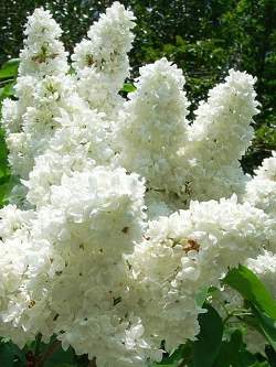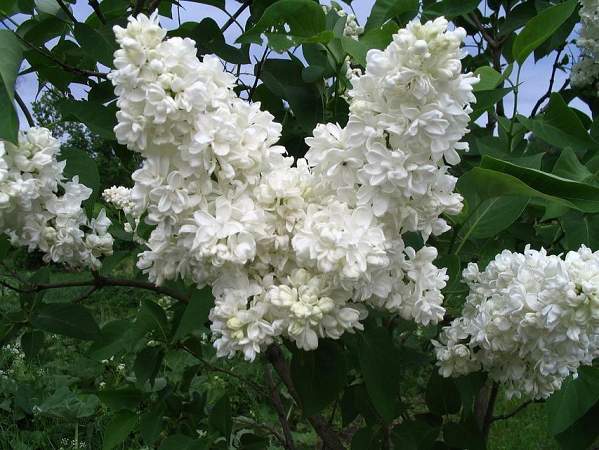Сирень Мадам Лемуан. Один из самых популярных сортов белой сирени. Куст сильнорослый раскидистый, около 3,5м высотой, с густой кроной и пряморастущими побегами. Цветет июне крупными, до 30см, соцветиями состоящими из 1 или 2-х метелок. Цветки ароматные махровые белого цвета, состоят из нескольких венчиков, в диаметре до 2-3см.