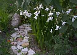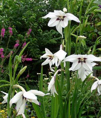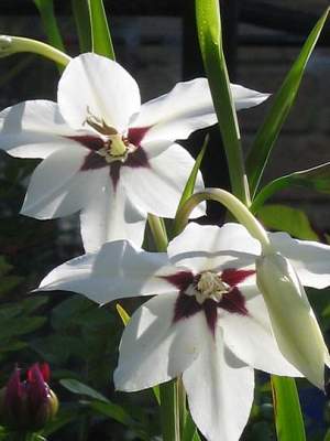 Ацидантера White (Вайт). Клубнелуковичный многолетник. Стебли прямостоячие, малооблиственные. Листья линейные или узкомечевидные, тёмно-зеленые. Цветки крупные 7-9 см в диаметре, очень изящные, с приятным тонким ароматом, белые, собраны в соцветие-колос.